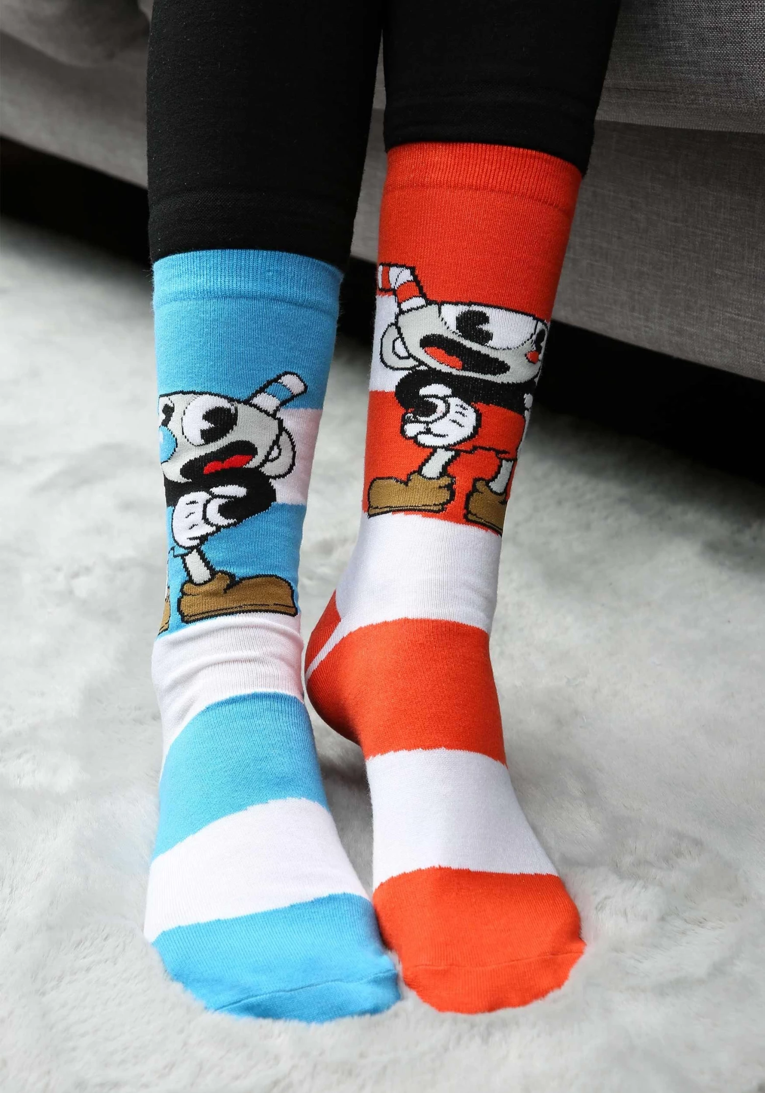 These are a pair of Adult Cuphead & Mugman Victory Crew Socks.