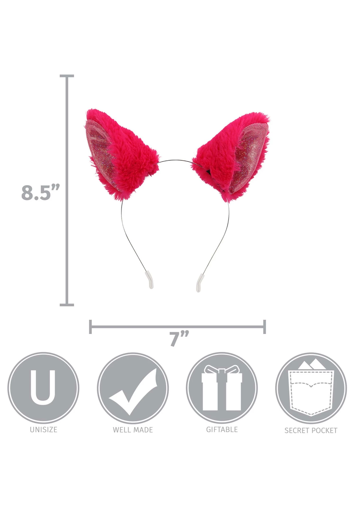 - Neon-bright magenta faux fur covers foam ears, lined w/ metallic knit