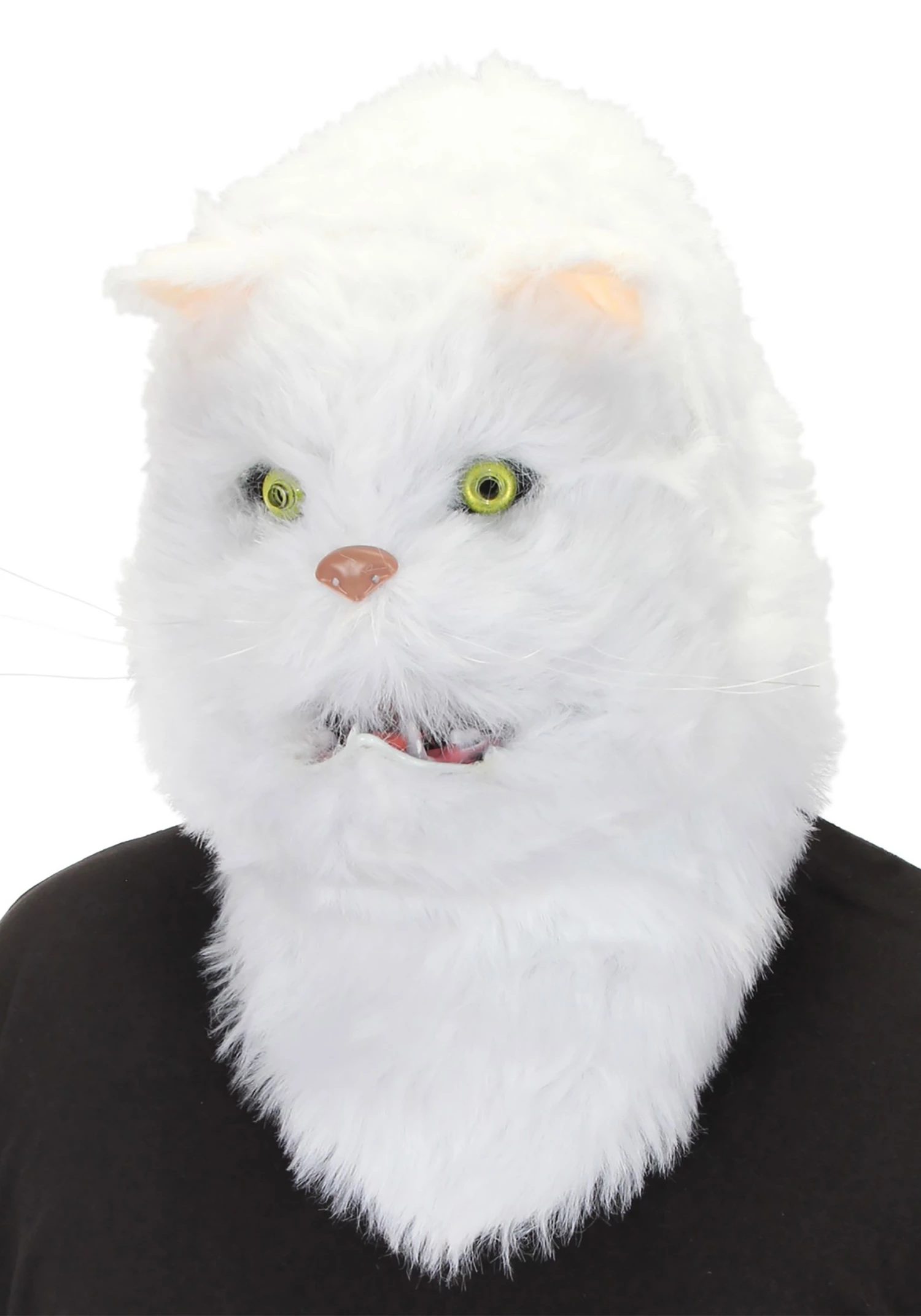 This fluffy white mask has bright green eyes, a sweet pink nose, sweet ears, and long whiskers. The fluffy fur covers the whole head and goes past the chin covering your human neck. It’s comfortable with foam throughout to hold it in place. The mouth moves when you talk so not only can your cat become human-sized, she can also hold a conversation.Â