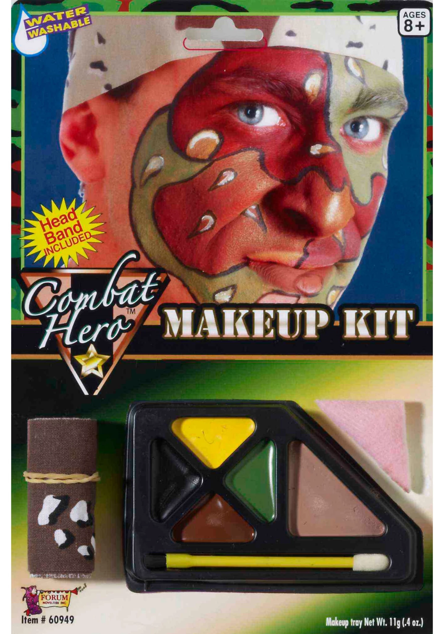 This accessory comes with everything you need in order to create a believable transformation. Use the sponge to make a camo pattern on your face. Outline that pattern in the black makeup with the included mini-brush. Fill in all the shapes you drew with the brown, dark green, bright yellow, and black face paint. We should note that this combat hero makeup kit also comes with a headband that will work with any costume.Â