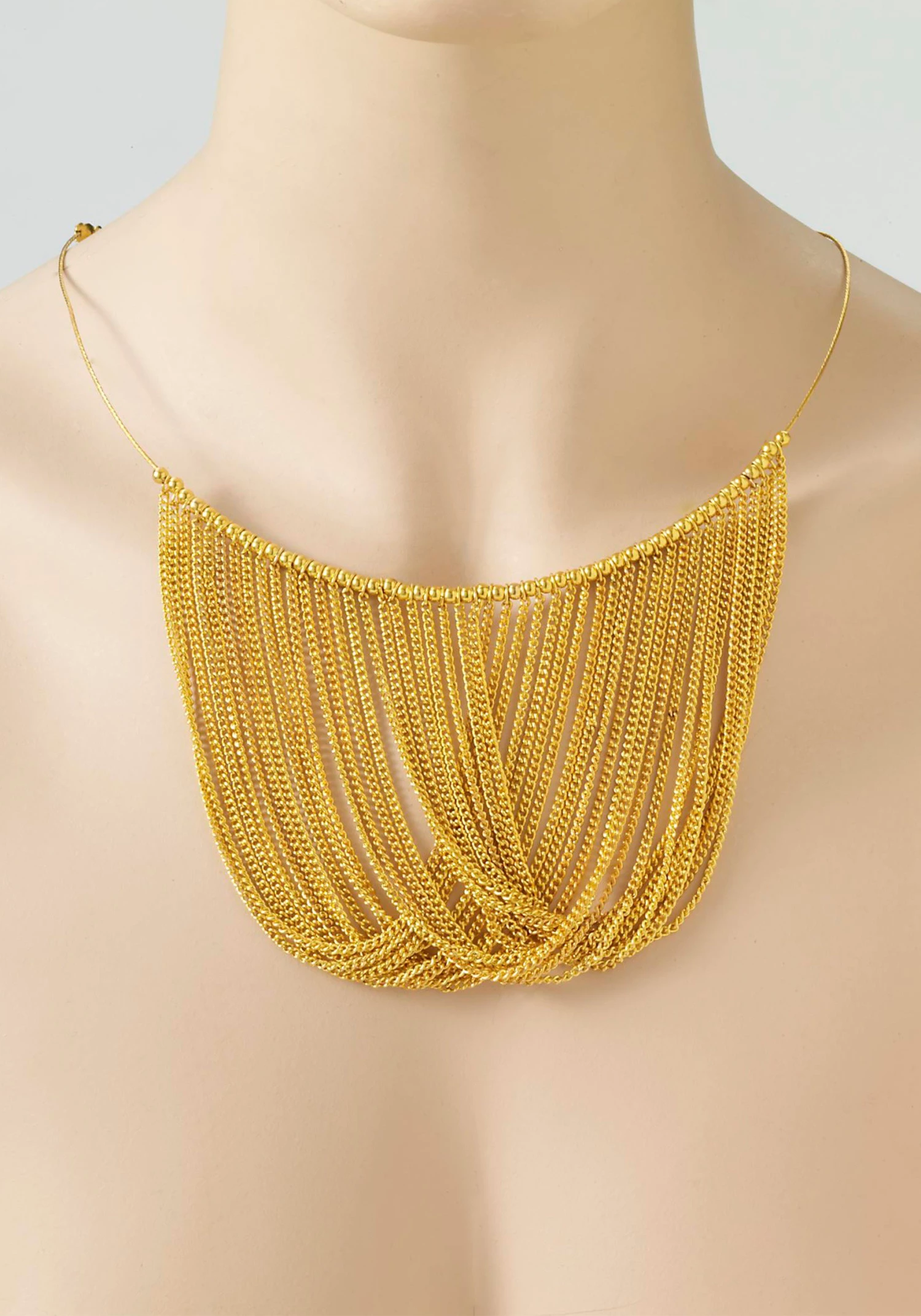 - 23 looped gold-tone chains hang from front