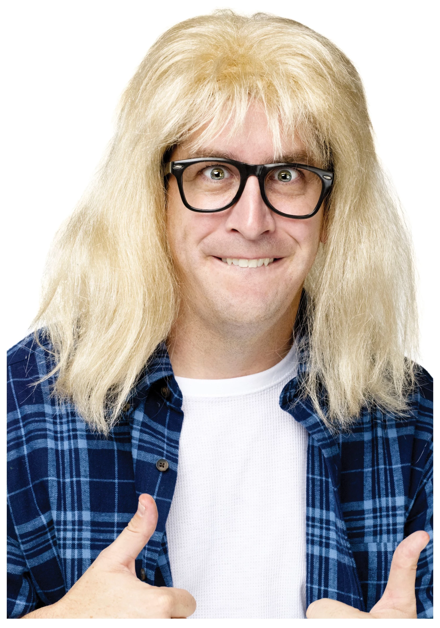 Fortunately, though, you can bring it back on the air and live with this SNL Garth Algar wig. Keep your locks golden blond and in perfect 1990s style with this completely synthetic and totally styled hairdo. The elastic lined interior keeps it comfy while you’re rocking out—and we’ve even included the equally radical black frame and clear lens glasses to ensure that you are excellent in your role. Now just get that voice warmed up because… It’s Wayne’s World… Wayne’s World… Party Time… Yeah. You’re ready.Excellent!