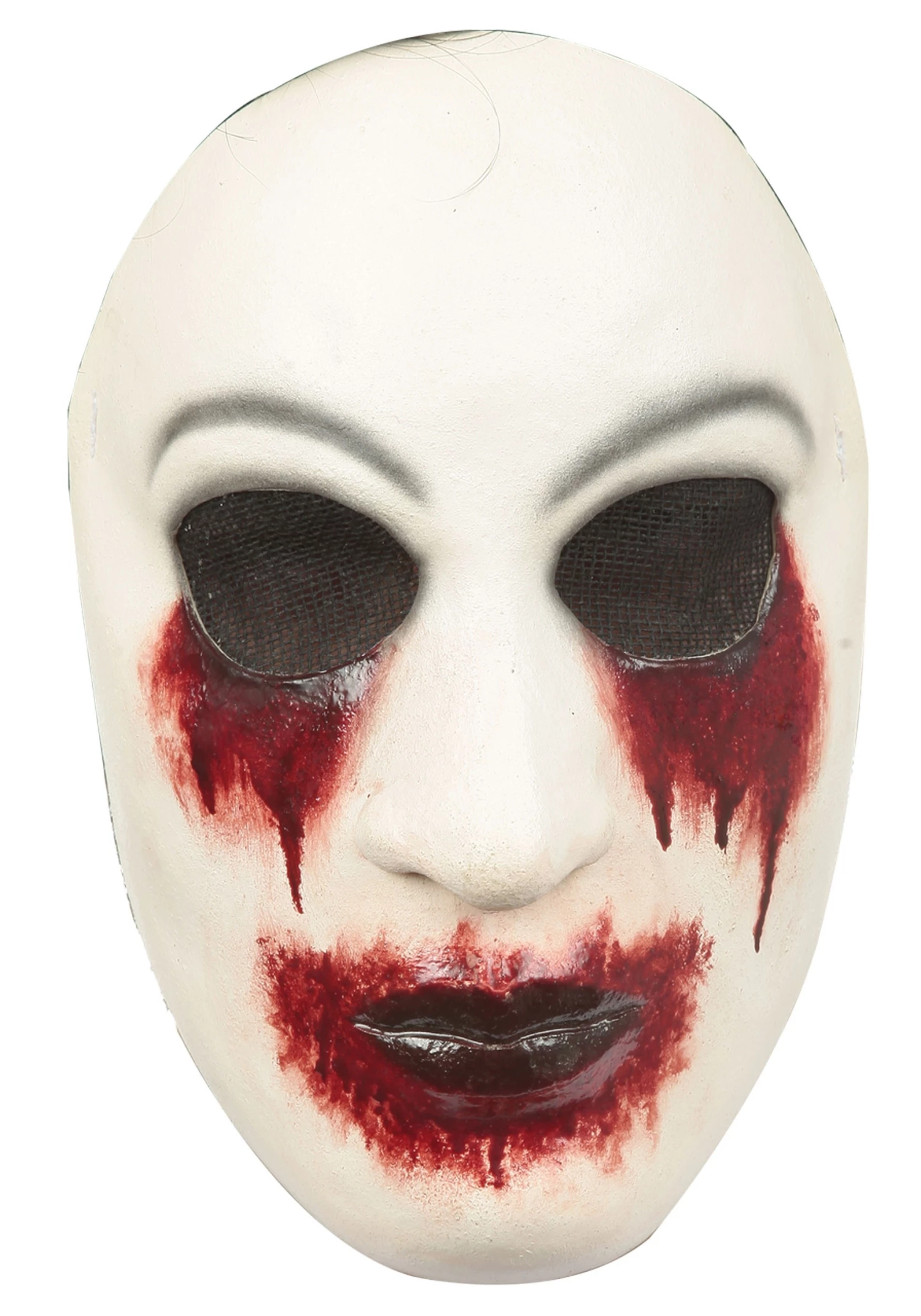 This half mask has a dramatic look with a flat white color and dripping red around the eyes and around the mouth. There are subtle over the eyes with a black mesh over the eyes to make your eyes blend into the darkness of the nightmare you might be hiding!Â