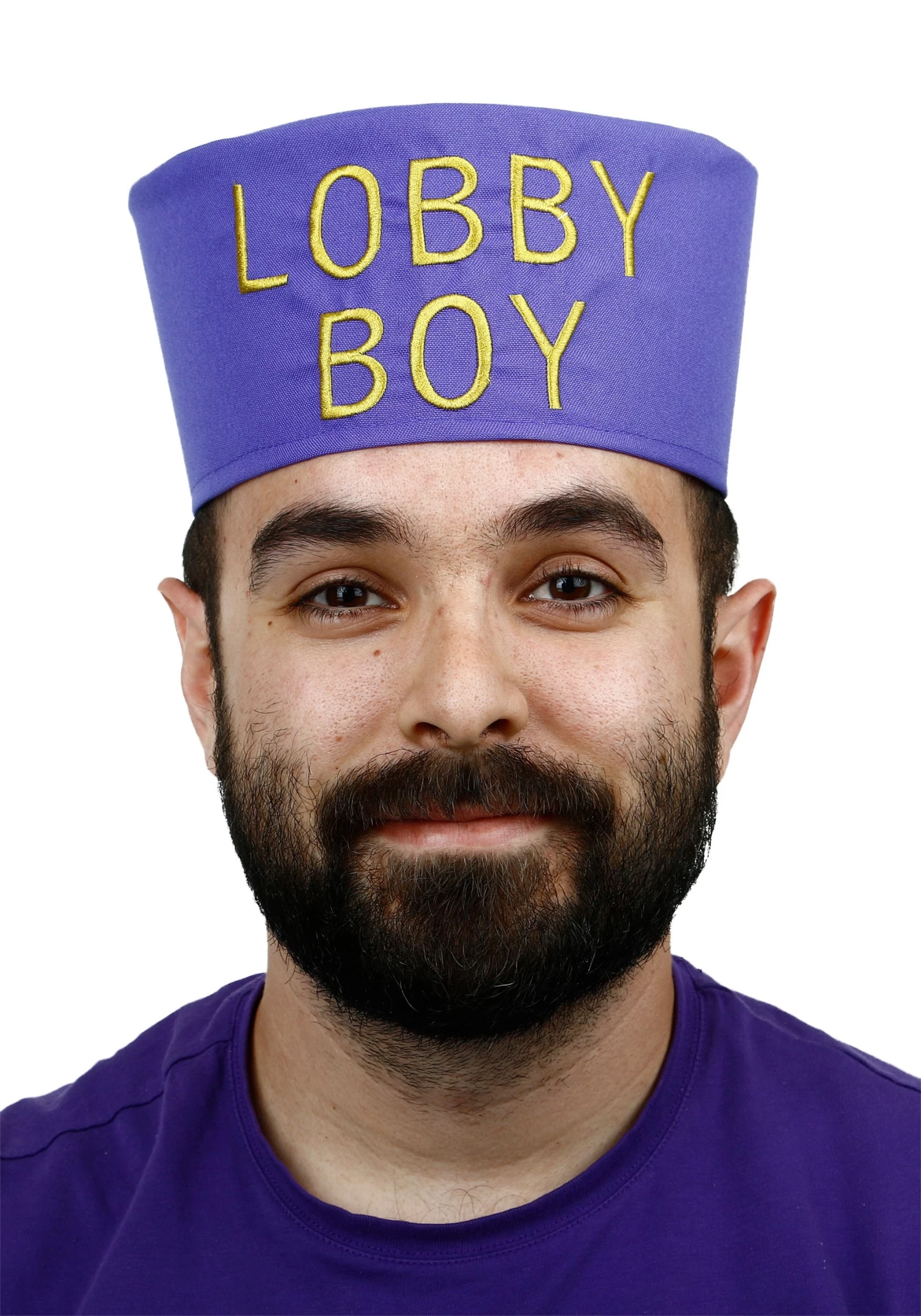 - Pill-box hat has “LOBBY BOY” embroidered on front in gold