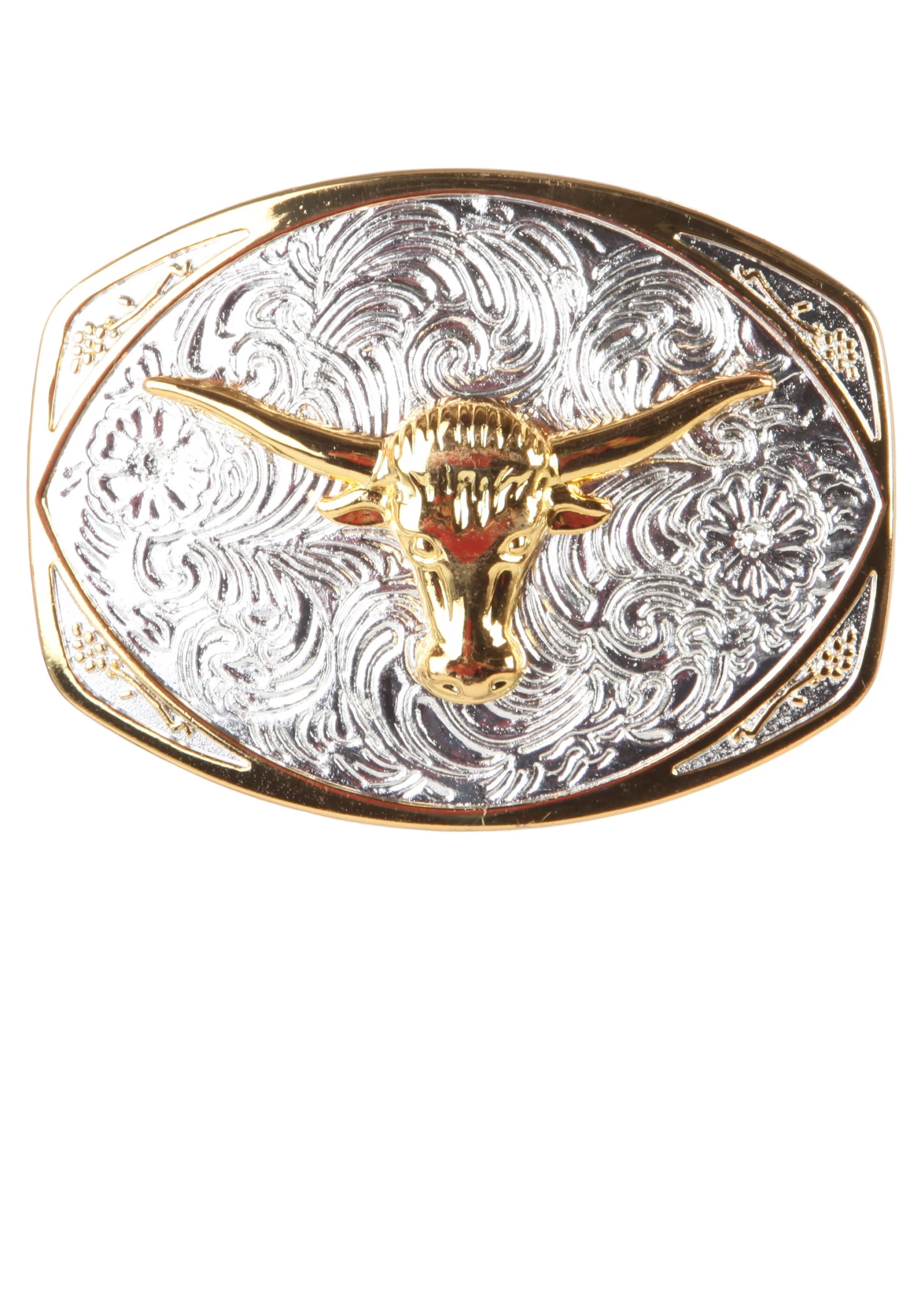 - Silver metal belt buckle w/ gold longhorn in front